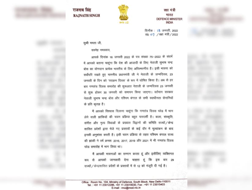 दरअसल, ममता ने स्वतंत्रता सेनानियों के योगदान पर आधारित पश्चिम बंगाल की झांकी को खारिज करने पर हैरानी जताई थी। मुख्यमंत्री ने कहा था कि प्रस्तावित झांकी नेताजी सुभाष चंद्र बोस की 125वीं जयंती वर्ष पर उनके और आजाद हिन्द फौज के योगदान की स्मृति में बनाई गई थी। ममता को केंद्र का जवाब राजनाथ सिंह ने चिट्ठी में लिखा है, ‘हमारी सरकार ने ही 1943 में नेताजी के नेतृत्व में बनी भारत की निर्वासित सरकार की 75वीं वर्षगांठ 2018 में भव्य रूप से मनाई थी और गणतंत्र दिवस परेड में आजाद हिंद फौज के जीवित सेनानियों को शामिल कर सम्मानित भी किया था।
