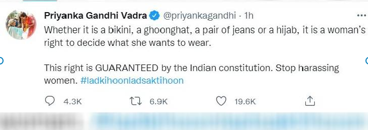 कांग्रेस महासचिव प्रियंका गांधी वाद्रा (Priyanka Gandhi Vadra) ने कर्नाटक (Karnataka) के कुछ शिक्षण संस्थानों में हिजाब (Hijab) को लेकर खड़े हुए विवाद को लेकर एक बयान दिया है. उन्होंने कहा, यह फैसला करना महिलाओं का अधिकार है कि उन्हें क्या पहनना है तथा पहनावे को लेकर उत्पीड़न बंद होना चाहिए. उन्होंने “लड़की हूं, लड़ सकती हूं” हैशटैग से ट्वीट किया, चाहे वह बिकनी हो, घूंघट हो, जींस हो या हिजाब हो, यह फैसला करने का अधिकार महिलाओं का है कि उन्हें क्या पहनना है.