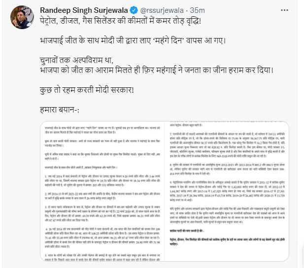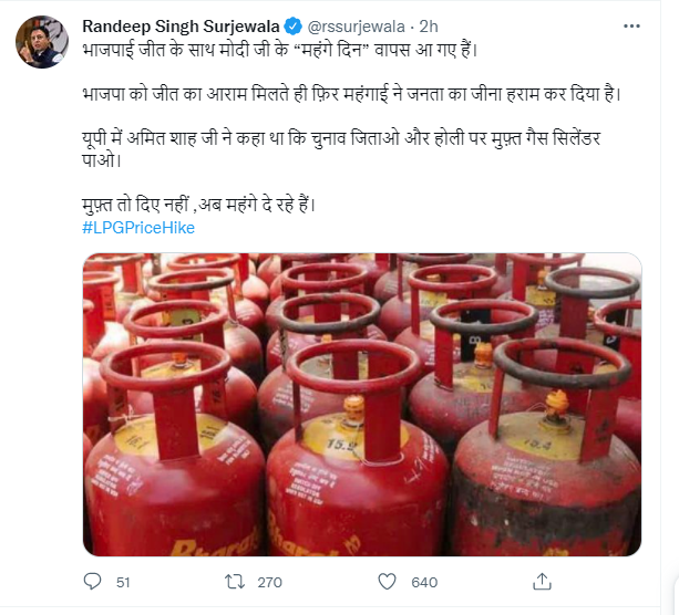 वहीं बढ़ती महंगाई को लेकर कांग्रेस ने बीजेपी पर निशाना साधा है. कांग्रेस के राष्ट्रीय प्रवक्ता रणदीप सुरजेवाला ने गैस के दामों में बढ़ात्तरी को देखते हुए ट्वीट कर कहा, ‘महा-महंगाई – भाजपा लाई’. उन्होंने अपने ट्वीट में कहा अब गैस सिलेंडर पर 50 रुपये बढ़ा. दिल्ली व मुंबई में गैस की कीमत 949.50 है. वहीं लखनऊ में 987.50 रुपये.